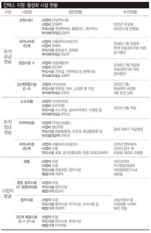 오는 9월 28일 킨텍스 제2전시장이 완공을 앞두고 있는 가운데 킨텍스의 8개 지원·활성화시설 사업 진행이 대체적으로 지지부진한 것으로 나타나고 있다. 레이킨스몰, 차이나타운 1단계, 복합시설에는 각각 사업자를 정해 토지매각이 이미 이뤄졌고, 스포츠몰, 아쿠아리움도 사업자에게 토지를 임대 완료했으나, 호텔사업, 구 공항터미널의 영업·업무시설, 2단계 복합시설은 아직 사업자를 구하지 못한 채 사업진척이 더딘 형편이다.