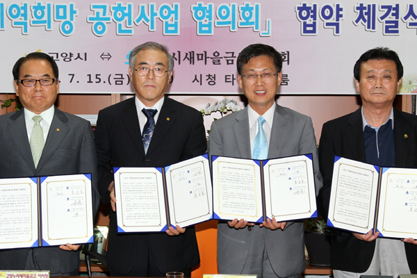고양시 새마을금고가 한데 뭉쳐 ‘지역사회 희망공헌’을 선언했다. 일산새마을금고(이사장 홍성호), 고양동부새마을금고(이사장 유순원), 고양누리새마을금고(이사장 김상철)는 15일 고양시 타운미팅룸에서 최성시장과 협약식을 체결했다. 새마을금고 운영 수익의 일부를 뚝 떼어 고양시를 위해 기부하겠다는 나눔 실천을 위한 공식 약속이었다.