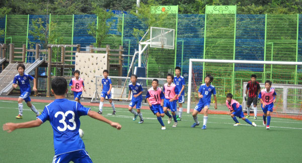 초록색 잔디구장을 달리는 아이들은 축구복을 제대로 갖춰 입고 제법 선수다운 모습이다. 주변엔 응원나온 어머니 10여명과 축구관계자들이 패스 미스가 나면 탄식을 쏟아내고, 프리킥이 나오면 눈빛을 반짝인다. 하지만 어느팀이 반드시 이겨야 하는 경기는 아닌 것 같다. 간간이 일본어가 들려온다. 경기도 대회에서 준우승을 할 정도로 실력이 짱짱하다는 오마초등학교 축구부와 일본 구마모토 축구부는 지난 19일 오전 친선경기를 가졌다. 일본의 구마모토 축구협회와 고양시 축구협회가 벌이는 연례 유소년 축구교류 행사다. 해마다 일본과 한국을 번갈아 오간다.