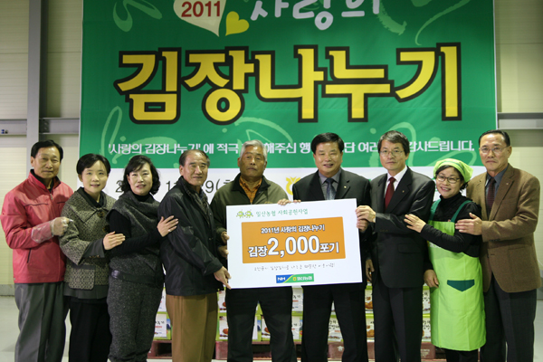 지난달 29일 일산농협 백석동 영농지원센터에서 ‘2011 사랑의 김장나누기’ 전달식<사진>이 진행됐다. 2005년부터 매년 일산농협 임시총회가 열리는 날에 자체 봉사단체인 행복봉사단 회원 100여명과 조합원, 고객, 임직원 및 그 가족은 물론 지역의 많은 분들이 참여해서 사랑나누기 봉사축제의 한마당으로 이어오고 있는 것.