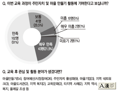 교육생 중 200명이 설문에 응답한 자료에 의하면, 교육내용 중 과정 전체적인 편성의 적절성에서 69.5%, 교육시간 적절성 55.5%, 교육 진행방식(토론과 발표) 73.5%, 교육 난이도는 61.5%가 만족하는 것으로 나타났다. 교육 수료 후 시정에 활동하고 싶은 분야에서 마을만들기 27%, 참여예산 13%, 다시 받고 싶은 강의 내용에서 마을만들기 19.5%순이었다. ‘이번 교육의 과정이 주민자치 및 마을 만들기 활동에 기여한다고 보느냐’는 질문에 21.5%가 매우 만족, 51%가 만족한다고 답했다.