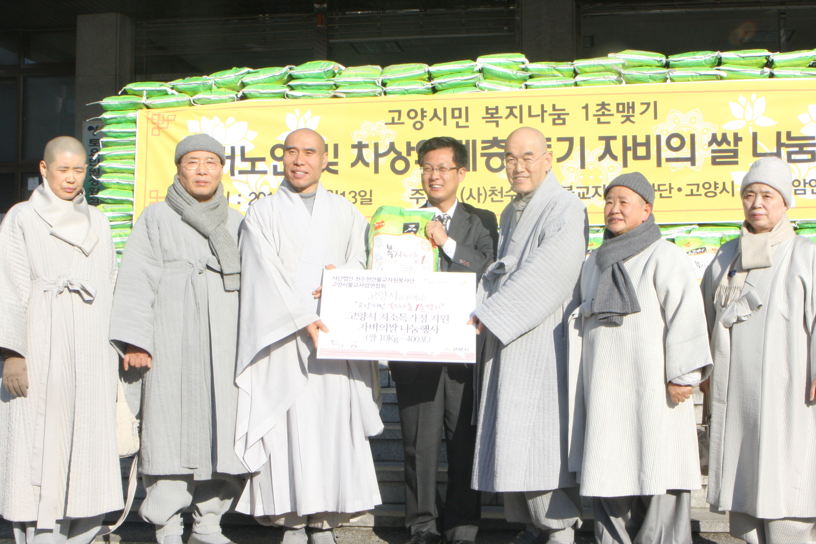 이날 행사는 민ㆍ관 거버넌스형 복지 나눔 운동으로 추진하는 ‘고양시민 복지 나눔 1촌 맺기’사업의 일환으로 진행되었으며 사단법인 천수천안불교자원봉사단 고양시 불교사암연합회에서 제공한 10kg 쌀 400포대가 고양시에 전달되었다. 이 쌀들은 복지지원과를 통해 고양시내의 독거노인 및 차상위계층에게 전달될 계획이다.