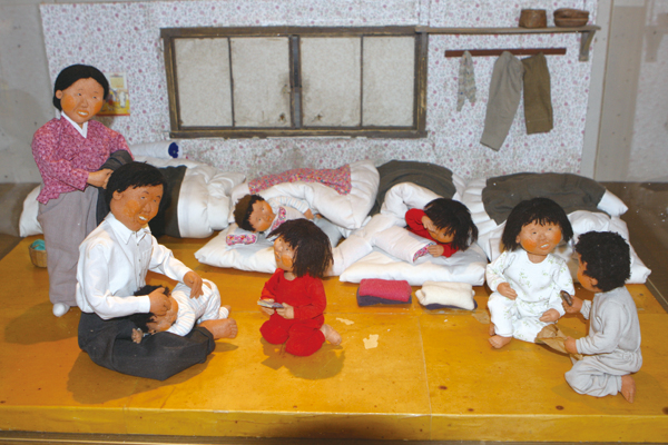 전시장에 들어서면 마치 타임머신을 타고 50~60년 전으로 돌아간 듯한 착각에 빠지게 된다. 어릴 적 동네골목에 찾아오던 목마, 난로에 도시락 얹어놓고 손을 호호 불며 공부하던 교실, 아랫목 이불 속에 묻어두었던 아빠의 밥그릇, 역전 다방과 수레를 세우고 기다리는 수레꾼들의 모습, 어릴 적에는 엄마가 세수시켜주는 게 왜 그렇게도 싫었는지. 전시된 인형들이 잊고 지내던 어릴 적 추억들이 새록새록 생각나게 한다.