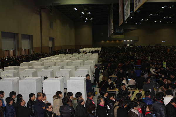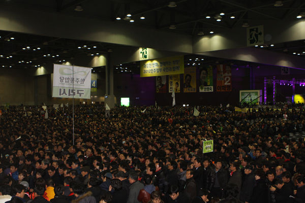 민주통합당 초대대표로 선출된 한명숙 전총리는 자못 비장한 어조로 수락연설을 했다. 한명숙 대표체제로 귀결된, 지난 15일 킨텍스에서 있었던 '민주통합당 당대표 및 최고위원 선출 전당대회'의 뜨거운 열기는 시작 시간인 오후 1시30분 이전부터 시작됐다.