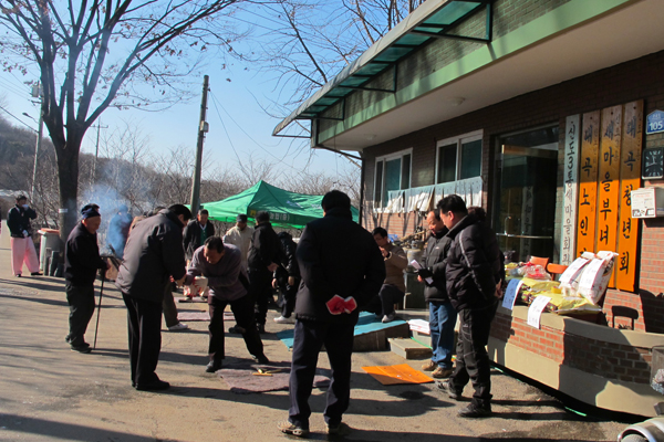 한쪽에서는 부녀회원들이 점심에 드실 육개장과 식사를 준비하고 있었다. 한쪽에서는 모닥불을 펴 놓고 삼겹살을 굽고 막걸리와 소주 한잔에 목을 축여가며 들떠 있었다. 윷판이 벌어진 마을회관 앞마당에서는 어쩌다 모나 윷이 나오면 취기에 들떠있는 사람들이 “윷이다, 모다”라고 소리를 내며 떠들썩했다.
