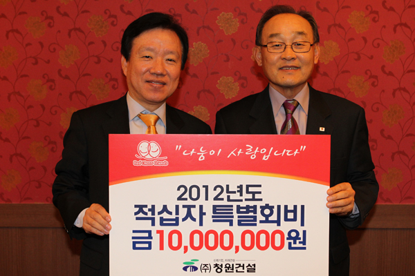 15일 청원건설 박용섭 대표이사<사진 왼쪽>는 적십자 봉사회 고양지구협의회(회장 박미화) 봉사원들과 함께한 오찬에서 문병대 대한적십자사 경기도지사 회장에게 적십자회비 1000만 원을 쾌척했다.