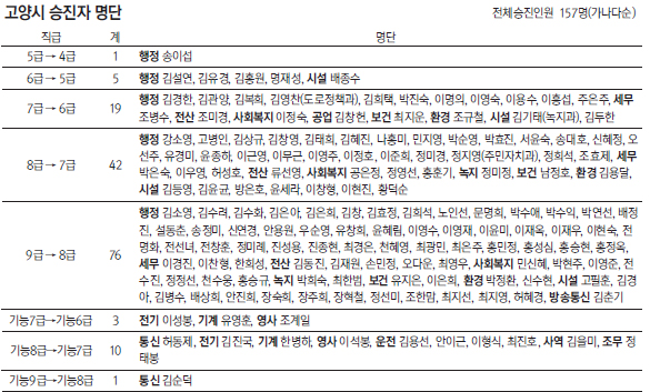 인사위원회는 평가중심의 승진심사를 통해 승진후보자 순위 50% 이내의 자는 징계 등 특별한 사유가 없는 한 승진예정자를 우선 반영하고, 승진후보자 50%이내 순위에 포함됐더라도 징계를 받았거나 업무수행능력이나 다면평가순위 등이 현저히 낮을 경우 이를 종합적으로 참고해여 제외하는 등 다양한 평가 자료를 활용했다고 밝혔다. 이번 인사에서는 승진자 전체 인원의 50%(78명)가 여성공무원이 차지했고, 사무관을 포함한 6명의 장애공무원이 승진의 기회를 잡았다.