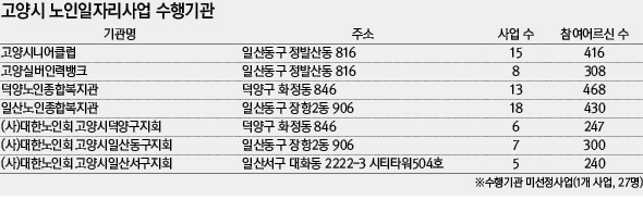 올해 노인일자리사업을 실제로 수행하는 곳은 고양시가 위탁한 7개 기관이다. 고양시니어클럽·고양실버인력뱅크·덕양노인종합복지관·일산노인종합복지관·대한노인회 고양시덕양구지회·일산동구지회·일산서구지회 등이 73개 사업을 나눠 수행하고 있다.