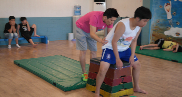 8일, 풍동에 있는 회사를 찾았을 때는 마침 점심식사를 마친 휴식시간이었다. 지적장애나 자폐증을 가진 아이들은 휴게실에서 잠깐 엎드려 단잠을 자기도 하고, 탁구를 치며 즐거워하기도 했다. 스포츠재활실에서는 교사가 아이들 한명 한명 튐틀넘기와 앞구르기를 지도하고 있었다. 교사와 학생들은 회사이름처럼 ‘함께하는 우리’가 되어 한 덩어리가 됐다. 차례를 기다리던 남학생이 홍 대표를 보자 반갑다는 듯 어깨동무를 하며 엉겨붙었다. 홍 대표는 “며칠 전에 실연당한 친구”라고 소개했다.
