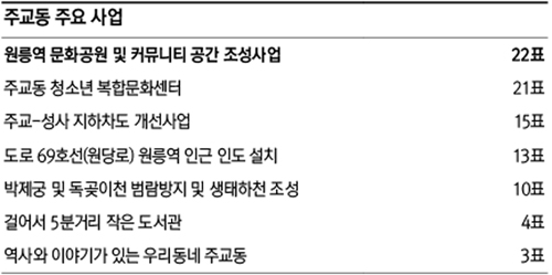 주민총회를 위해 준비위원회는 7가지의 주요 의제를 논의 끝에 결정됐다. 주민들이 가장 중요한 사업으로 꼽은 원릉역 문화공원 조성사업은 현재 사용하지 않는 원릉역사를 주민들의 커뮤니티 공간으로 만들겠다는 것. 특히 허수경 시인이 주교동에서 여러 작품들을 남겨 이를 기념하고 아이들에게는 자부심과 꿈을 키워주는 공간으로 만들겠다는 취지다. 소요예산은 7000만원. 주교동 주민총회 준비위원회는 권명애 위원장 남선우 부위원장 왕한모 송재은 임진혁 박찬권 오재화 현복례 조재승 김기호 위원이 참여하고 있다.