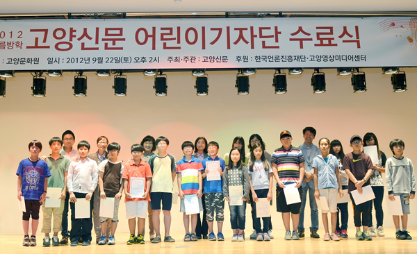 고양신문 어린이기자단 수료식이 22일 고양문화원 대강당에서 열렸다. 8월 4회 교육과 1번의 워크샵을 통해 기자정신, 기사쓰기, 사진, 편집 등 신문만들기 전문 교육을 받고 실습과 실제 제작과정까지 경험한 어린이기자 30명이 이날 수료증을 받았다.