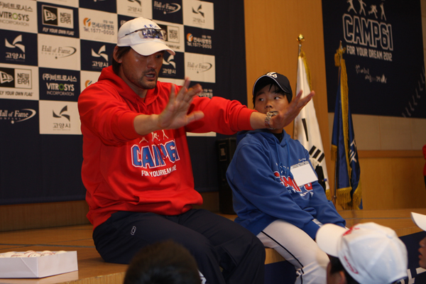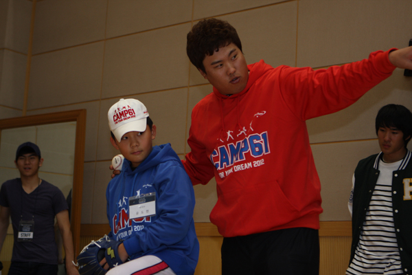 27일 고양시 박찬호 유소년야구캠프 현장. ‘코리안특급’박찬호 선수가 유소년 선수들이 모인 곳에서 어린 시절 경험담을 한창 이야기하고 있었다. 메이저리그 아시아 최다승(통산 124승)에 빛나는 대선배의 진지한 조언에 아이들의 눈도 반짝거렸다. 옆에서는 류현진, 송승준 등 프로야구 스타선수들이 아이들 한명 한명을 붙잡고 투구훈련에 한창이었다. 참가학생들은 선망의 대상인 대스타들이 자신들을 직접 지도한다는 사실에 절로 신바람이 났다. 우천관계로 실내에서 진행된 박찬호 유소년야구캠프 첫날은 이처럼 시종일관 활기찬 분위기속에 하루가 저물어갔다.