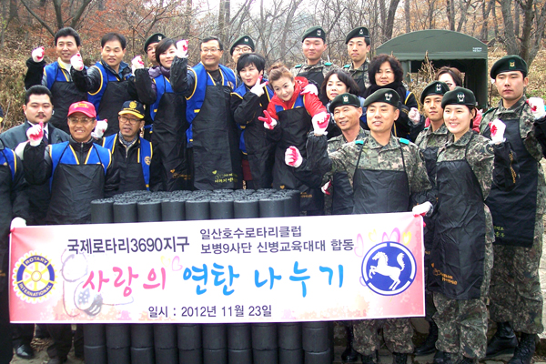 지난달 23일, 국제로타리3690지구 일산호수로타리클럽(회장 김조회)은 보병 9사단 신병교육대 장병,조성권 대대장, 봉사프로젝트위원들과 함께 덕양구 고양동 거주 독거노인 여섯 가정에 사랑의 연탄 2,000장을 선물했다. 특히 9사단 신병교육대대 부대원들은 동전 모으기로 25만 100원을 모아 ‘사랑의 연탄 나누기’ 연탄 구입 기금에 보탰다. 고양동에 거주하는 독거 할머니는 연탄나누기에 동참한 호수로타리클럽회원들과 장병들에게 무와 과일을 대접하며 감사를 표했다.