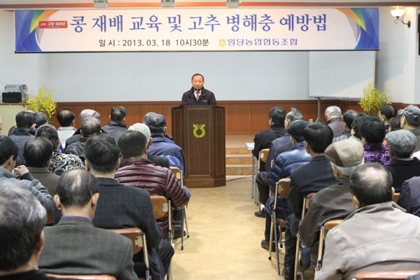 원당농협(조합장 정명훈)은 지난 18일 원당농협 본점 대회의실에서 고품질 콩과 고추 재배기술을 주제로 고양시 농업기술센터 기술보급팀 최용암 팀장을 강사로 초빙해 농업인 영농교육을 실시했다. 농업인 영농교육은 FTA 등 국내·외 농업환경 변화에 대응하고 선진농업기술을 보급하기 위해 해마다 진행하고 있다. 이날 교육에서는 콩과 고추 분야별 새로운 영농기술소개와 병충해 예방 및 방제를 통한 고품질 농산물 재배기술을 소개하는 등 농업인 맞춤형 기술교육에 중점을 뒀다. 이번 교육은 당초 예상한 인원보다 많은 200여명 이상의 농업인이 참여해 입석으로 교육받으며 자리를 뜨지 않는 교육열기를 보여주었다.