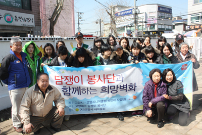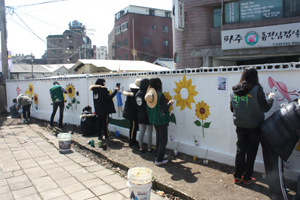 23일, 어르신들의 뻥튀기 작업장인 시니어클럽 능곡 이음센터 벽에는 올 들어 주춤주춤 소심하게 다가오는 봄이 완연한 모습으로 들어와 앉았다. 21명의 학생과 8명의 학부모로 구성된 고양예고 담쟁이 봉사단이 오래되어 낡고 시커멓던 이음센터의 벽을 산뜻한 봄으로 단장<사진>시킨 것이다.