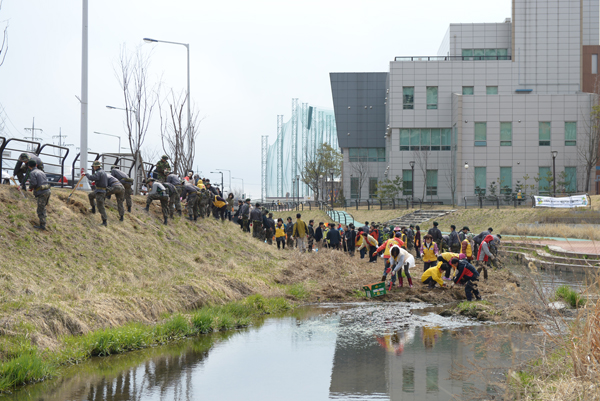 대한적십자사봉사회 고양지구협의회(회장 박미화)의 민간단체 수질보전 활동인 ‘살아숨쉬는 아름다운 도랑! 견달산천’ 조성사업이 10일 오후 1시 일산동구 식사동 견달산천에서 있었다.<사진> 이날 활동에는 박미화 고양지구협의회장과 이상영 일산동구청장, 김영덕 고양시 생태하천과장, 적십자 봉사원, 식사동 지역내 초중고 학부모 등 300여명이 참여해 환경개선운동으로 물억새, 노랑창포, 부들, 스쿠렁, 조팝나무 등 8000주를 심었다.