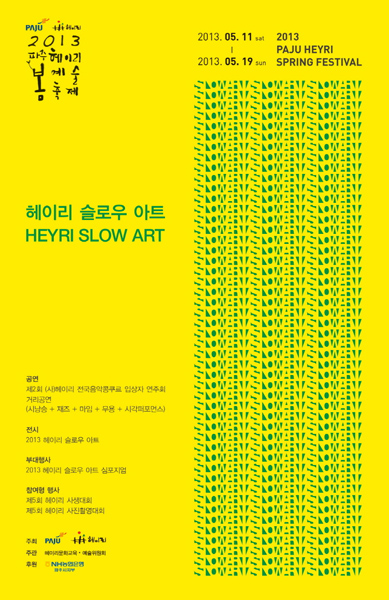 헤이리 예술마을에서 5월 11일부터 ‘2013 파주 헤이리 봄 예술축제’가 열린다. 메인 기획전시인 ‘슬로우아트전’, 5회째를 맞는 헤이리 사생대회, 사진촬영대회와 더불어 제2회 (사)헤이리 전국음악콩쿠르 입상자 연주회, 시낭송과 마임공연 등이 헤이리 일대에서 9일간 펼쳐진다.
