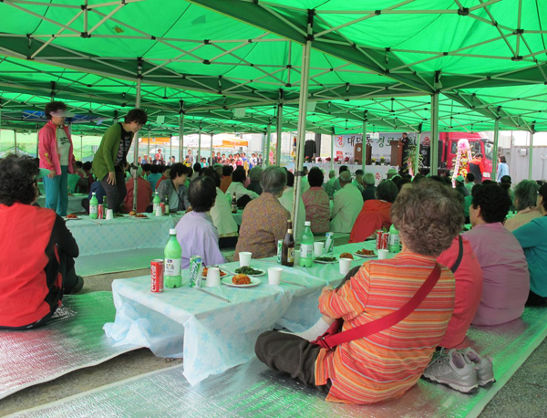 7일 대덕동 경로잔치가 열린 복지회관 부지에서는 새마을 지도자(회장 정송학), 부녀회(회장 이연희), 주민자치위원회(위원장 김학운), 통장협의회(회장 유병례) 등 각 직능단체 회원들이 어르신들 안내와 상차림 준비에 분주했다. 박민선씨의 사회에 따라 유치원 어린이들의 재롱잔치가 벌어지자 어르신들은 즐거운 표정을 지었다.