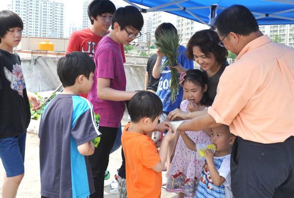 지난 8일 이 도서관 옥상에서 작은 수확체험이 있었다. 봄부터 빈 스티로폴 박스에 상추, 고추, 방울토마토, 시금치, 깻잎, 오이, 완두콩, 그리고 딸기를 심었다. 방울토마토는 동그란 초록색 구슬 만하게 컸고, 시금치는 벌써 꽃대가 쑥 올라왔다.