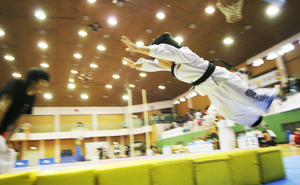 6월 8일 고양시청내 문예회관 체육관에서 열린 제 4회 고양시장기 합기도 동호인 대회에서 개인낙법 대회에 참가한 한 초등학생이 노란색 매트를 넘어 착지에 성공하려고 안간힘을 쓰며 도약하고 있다.