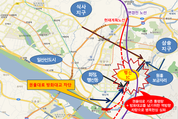 민경선 의원은 “방화대교 차단으로 인해 기존 6차선도로인 권율대로는 자유로 진출 2차선만 사용하는 반쪽짜리 도로로 전락하게 된다”며 “게다가 원흥, 삼송지구의 차량에 방화대교를 넘기 위한 역방향 차량까지 겹쳐 행신IC 부근의 병목현상이 심화될 것”이라고 우려했다. 사업자 측에서 이야기하는 교통분산효과 대신 교통마비를 가중시킬 가능성이 높다는 것.