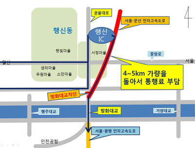 게다가 방화대교의 용도가 “유료도로인 인천공항고속도로의 교량역할로만 이용되기 때문에 차단해도 큰 영향이 없다”는 국토부와 사업자의 주장과는 달리 향후 방화로와 권율대로를 잇는 중요통로로 계획되어 있었다는 사실도 드러났다(박스기사 참조). 민경선 의원은 “강서구청의 노선계획에 따르면 장차 방화대교와 방화로가 연결돼 권율대로를 통해 손쉽게 무료로 강서구를 넘나들 수 있다”며 “하지만 서울문산고속도로가 방화대교를 차지하면서 고양시민들은 강서구와의 연결통로를 탈취당한 셈”이라고 주장했다.