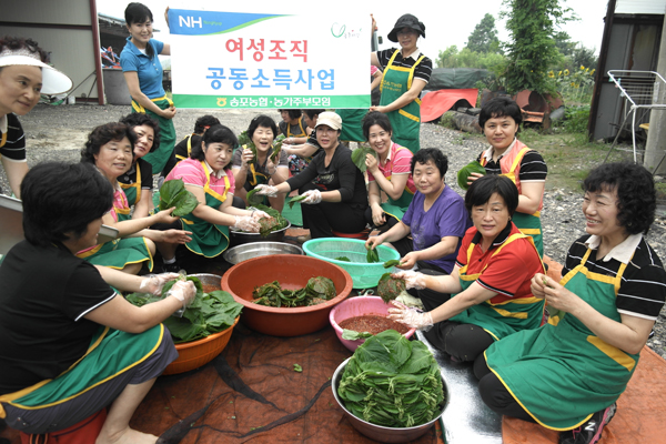 지난 4일, 일산서구 구산동 1493번지 이채순(56세) 회장집 마당에 송포농협(조합장 이재영) ‘농가 주부들의 모임(이하 농가주모)’ 회원 30여명이 모였다. 깻잎반찬·양파 오이피클을 담그기 위해서였다. 농사일로 눈코 뜰 새 없이 바쁜 이들이지만 이날 하루만큼은 공동작업을 위해 팔을 걷어붙였다. 이른 아침부터 재료를 다듬고 씻고 양념장을 준비했다. 한쪽에서는 간식으로 낼 부침개를 부치고 있었다. 오전 10시 무렵 깻잎반찬 만드는 작업이 시작됐다. 깻잎에 양념장을 바르기 무섭게 400그램씩 저울에 달아 포장했다. ‘누구네 고추농사가 잘됐다’는 등 이런저런 이야기꽃을 피우면서도 손은 바쁘게 움직였다. “깻잎에 양념을 두둑이 넣어줘요.” “어머, 깻잎이 날로 예뻐지네.” 이 회장은 추임새 넣어가며 회원들을 북돋웠다. 포장된 반찬이 금세 커다란 바구니에 한가득 쌓였다.