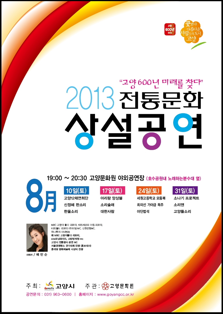 고양시가 주최하고 고양문화원이 주관하는 2013전통문화 상설공연 “고양 600년 미래를 찾다”가 고양문화원 야외공연장에서 8월 한 달 동안 매주 토요일(8월10일, 17일, 24일, 31일) 오후 7시부터 공연을 펼쳐 보인다.
