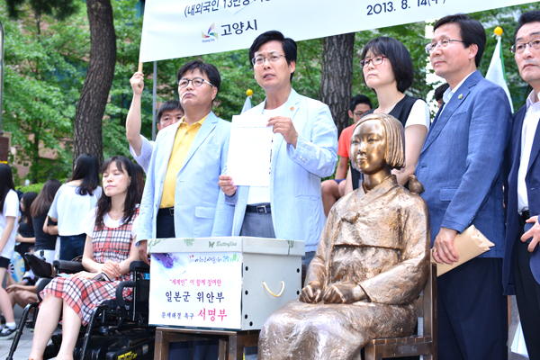 제 68주년 8.15광복절을 하루 앞둔 지난 14일 최성 시장과 시민사회단체 관계자 등은 일본 대사관을 방문, 일본군 위안부 피해자 문제 해결을 위한 시민 서명과 서한문을 전달했다.