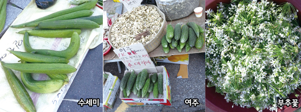 박연해 저는 함초를 사왔어요. 나물로 무쳐보려구요. 수세미, 여주, 부추꽃, 함초, 이런 것들은 마트에서는 볼 수가 없는 것들이죠. 재래시장은 살아있는 것, 죽어있는 것, 육·해·공 모두 모여있는 곳이네요.