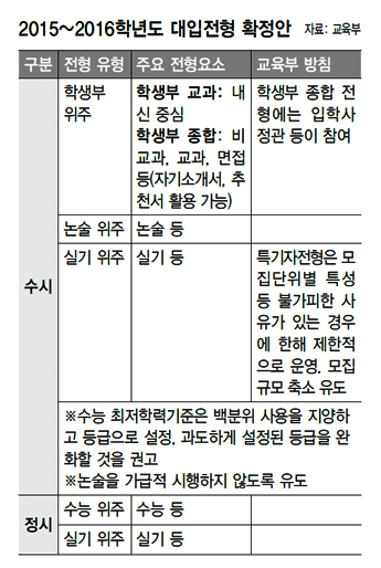 지난 9월 23일 추석 연휴가 끝나자마자 ‘2015~2016학년도 대입제도’ 및 ‘2015학년도 대입전형 기본사항’이 발표되었다. 아직 2014학년도 수학능력시험이 치러지지도 않은 시점에서 교육부와 한국대학교육협의회(이하 대교협)의 이번 발표가 오히려 늦은 것이 아니냐는 의견이 나올 정도로 그 변화의 폭이 상당히 크다. 현재 고등학교 2학년 학생들에게는 1년도 채 남지 않은 기간 동안 대입 전형 변화에 적응해야 하기 때문에, 학교 등 교육기관 뿐만 아니라 예비 고3 학부모들에게도 큰 관심거리가 아닐 수 없다.