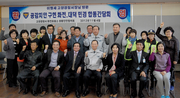 지난 4일 오후 3시 덕양구 화전동주민센터 3층에서 화전동과 대덕동 주민들이 참여한 가운데 고양경찰서장(서장 이형세)과의 민경합동간담회가 개최되었다. 고양경찰서와 화전파출소, 생활안전협의회가 주최·주관한 행사였다.