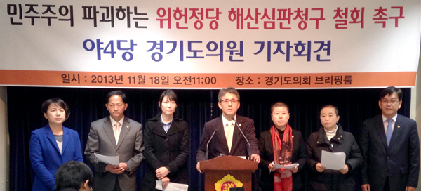 경기도의회 민주당과 정의당, 노동당, 통합진보당 등 야 4당 소속 의원 7명은 18일 기자회견을 열어 “통합진보당에 대한 위헌정당 해산심판 청구와 정당활동 중지 가처분 신청을 철회하라”고 정부에 요구했다.