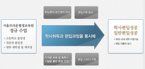 서울브라운평생교육원은 26년 전통의 편입전문 교육기관으로 학사편입 합격률 전국 1위로 특화된 편입 교육과정이다. 고등학교 졸업이상의 학력을 가진 학생이라면 신·편입생으로 누구나 지원할 수 있으며, 일반편입과 학사편입으로 서울권 ‘명문대 진학의 새로운 길’을 제시한다.