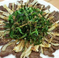 더덕은 껍질을 벗겨 2~3등분한 후 소금물에 담갔다가 건진다. 종이타월에 감싸 얇게 밀어 결대로 찢으면 된다. 쇠고기에 양념을 버무린 후 얇게 저며 썬 다음 가루를 묻혀 달구어진 팬에 노릇하게 굽는다. 구운 고기 윗면에 곱게 채 썬 채소를 듬뿍 얹어 돌돌 말아 먹기 좋게 썰어 드레싱을 곁들이면 된다.