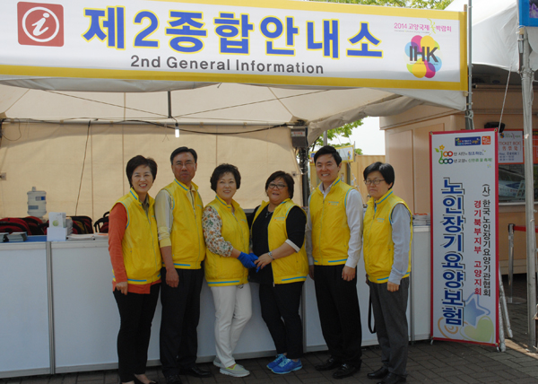 지난 25일 개장한 ‘2014 고양국제꽃박람회’ 제2종합안내소 앞에서 노인장기요양보험제도(이하 요양보험) 홍보활동이 한창이었다. (사)한국노인장기요양기관협회 경기북부지부 고양지회 회원들은 꽃박람회 기간인 17일 동안 4명씩 오전·오후로 교대해가며 요양보험 홍보활동을 실시할 계획이다.