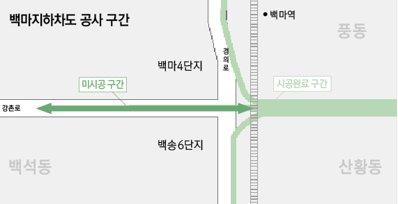 공사비 190억원의 백마역 지하차도 공사는 공사구간 총 760m로, 경의선 복선 전철 사업으로 단절된 일산신도시와 풍동지구를 연결하기 위한 목적으로 2009년 공사를 시작했다. 그러나 2011년 11월 공정률 60%에서 인근 백송6단지 아파트(백석동) 주민들의 민원에 부딪혀 공사가 중단됐다. 현재는 전체 구간의 3분의 1가량인 263m 구간만 남겨놓은 상태. 공사가 중단되자 풍산동 주민들이 공사재개를 요구했고 시와 공단은 지난해 9월 공사 재개에 원칙적으로 합의하고 반대 주민 설득에 노력해 왔다.