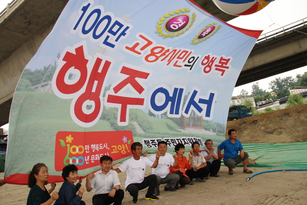 행주동(동장 최석규) 주민센터는 지난 5일 행주대교 북단 입구에서 고양시 100만명 돌파 축하 기념 애드벌룬 띄우기 행사을 가졌다<사진>. 애드벌룬 띄우기에는 최석규 동장과 주민센터 직원, 장희진 주민자치위원장, 이용태 체육회장, 조순득 부녀회장, 박찬수 행주어촌계장, 행주외동 노인회장, 지역주민 등이 참석해 다 함께 축하했다.
