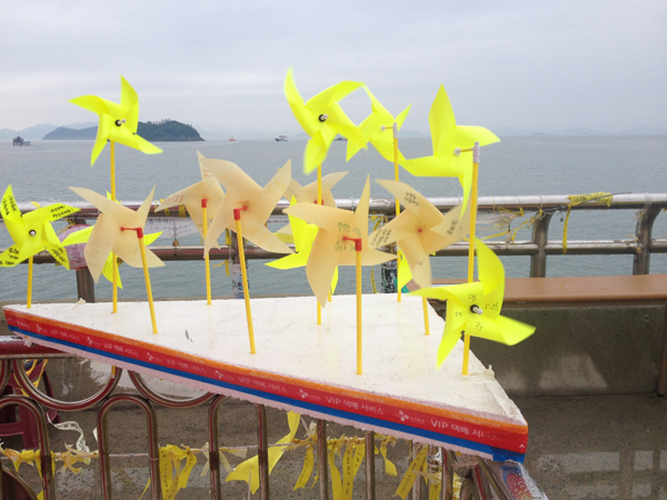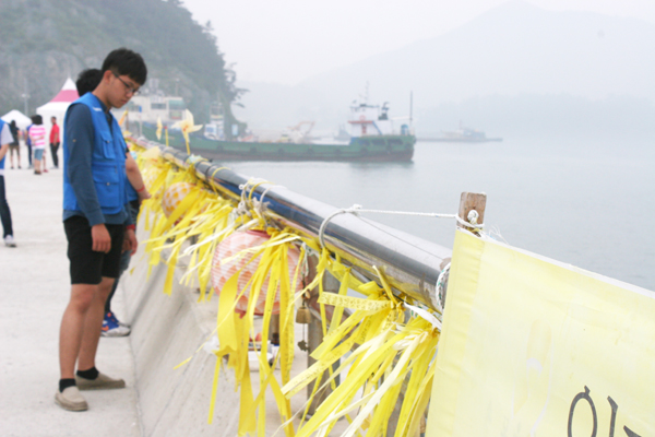 진도항 곳곳에는 사진촬영을 하지 말라는 안내문이 붙었다. 두 가족, 3명의 유족이 남아있다는 진도항에는 관련 지원시설이 아직 많이 남아있었다. 가족들이 지내는 가건물을 식당, 경찰, 유관기관의 컨테이너 박스가 둘러싸고 있다. 진도항 다리위에는 많은 시민들이 달아놓은 노란 리본과 메시지가 길게 늘어서 있었다. 아이들의 손을 잡은 가족단위의 방문객들도 눈에 띄었다. 세차게 부는 바닷바람에 노란 바람개비와 풍경, 리본이 나부끼며 보는 이들을 더욱 안타깝게 했다.