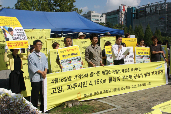 세월호 진상규명 특별법 제정을 위한 릴레이 현수막걸기운동에 고양시민들도 나섰다. 고양파주지역에서 세월호 특별법 서명운동을 주도해온 ‘고양-파주 0416세월호 밴드’회원들은 4일 일산문화공원에서 기자회견을 열고 ‘4.16km 릴레이 현수막 614개 설치운동’에 나서겠다고 밝혔다. 특별법 제정촉구를 위한 현수막 설치는 그간 서울 관악·은평·서대문구 등에서 진행됐었지만 고양파주 등 경기북부지역에서는 처음 추진되는 운동이다.