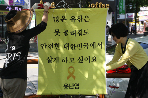 각 현수막에는 ‘수사권 기소권 없는 특별법은 허울없는 특별법’ ‘많은 재산은 못 물려줘도 안전한 대한민국에서 살게 하고 싶어요’등의 문구와 함께 현수막운동에 참가한 시민들의 이름이 적혀있었다. 모임을 주도하고 있는 길도형 장수하늘소 출판사 대표는 “서명운동기간 동안 250여명의 자발적 모금을 통해 장당 5000원씩 614개의 현수막을 준비했다”고 밝혔다. 일산 중앙로를 비롯해 그간 서명운동에서 소외됐던 고양, 관산 등 관내 외곽지역에 주로 설치할 예정이라고.
