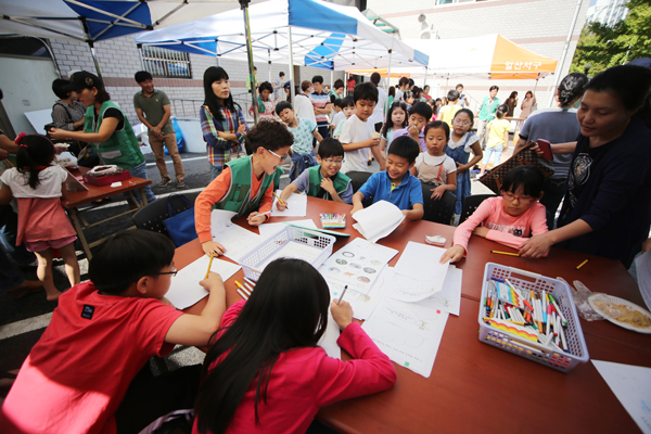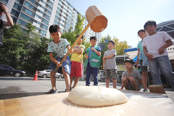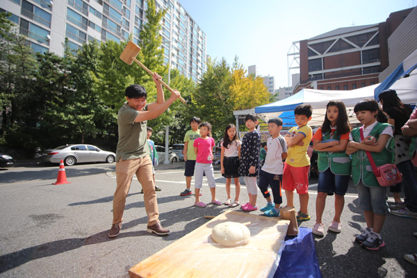 주민센터에 모인 참가자들은 먼저 ‘쌀은 생명이다’라는 주제로 쌀농사와 공동체 문화 형성의 배경에 대한 강연을 들었다. 이후 주민센터 앞마당에서 주민강사의 도움으로 아이들이 직접 떡메를 쳐서<사진> 인절미를 만들어보는 체험행사도 열었다. 체험행사까지 마친 아이들은 강연과 체험활동 내용을 그림과 글로 활동지에 표현해 쌀의 소중함을 되새겼다.