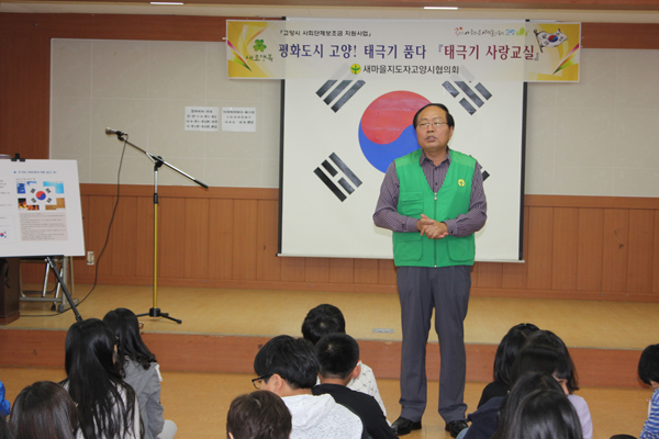 국경일! 집집마다 태극기를 다는 모습을 찾기 힘든 요즘 고양시에 있는 소만초등학교에서 10월 초에 소만초등학교 학생들 가정에 태극기 보유현황을 파악한 결과 보유율이 55%로 매우 낮고, 교육 부족으로 태극기를 게양이 매우 저조함을 알고 ‘새마을지도자 고양시협의회’에 태극기 지원과 교육을 요청하여 10월 8일 고양시 사회단체 보조금 지원사업의 일환으로 ‘새마을지도자 고양시협의회’의 지원을 받아 ‘태극기 사랑교실’의 주제로 강의가 있었다.