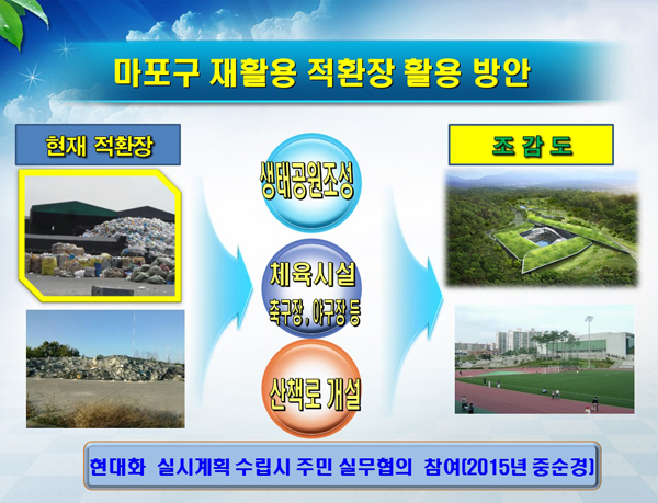 마포구 재활용 적환장 활용방안과 관련해서는 현재 적환장을 생태공원으로 조성하고, 체육시설, 산책로로 활용하는 방안을 주민들이 요구했다. 2015년 현대화 실시계획 수립시 주민 실무협의 참여도 약속됐다.