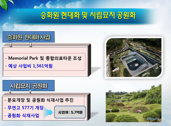 우선 장사시설과 관련한 피해보상과 관련해 고양시는 △서울시립 승화원의 현대화 및 시립묘지 공원화 △서울시립 승화원 부대시설 운영권 이양 △고양시민 화장장 사용료 인하 및 우선 사용권 부여 △고양 17, 19, 20통 도시가스 연결공사 △3-33호선 및 보광사로 도로 확, 포장 공사비 지원 △330번 버스노선 연장 △고양3통 야구장 및 쉼터 건립 △고양18통 용복원 주민편익시설(도로포장 및 복지관 건립) 등을 요구했다.