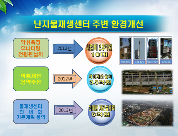 난지물재생센터 주변 환경 개선을 위해서는 2012년 악취측정 모니터링 전광판 10대 설치(사업비 2억8000만원), 악취 개선 용역 3억5000만원, 물재생센터 현대화 기본계획 용역 6억원. 난지물재생센터 현대화 지하화 추진은 2013~2019년까지 악취 저감시설을 494억원을 들여 설치하고, 2023년까지 분뇨 음식물 처리시설 지하화(761억원), 수처리 시설 복개화는 2030년까지 1570억원을 들여 진행한다는 계획이다.