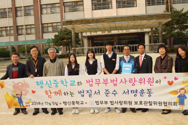 법무부 법사랑고양파주지역연합회 보호관찰위원(위원장 윤원식)은 지난 5일 덕양구 행신중학교에서 학생들을 대상으로 ‘법질서 준수 서명운동’을 진행했다.
