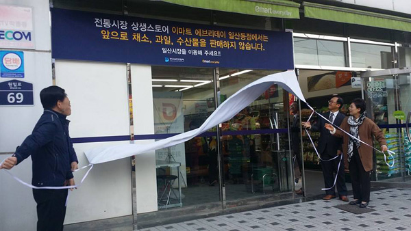 “전통시장인 일산시장과 이마트에브리데이 상생협약식이 전국2번째로 성사되었습니다. 일산시장부근 이마트에브리데이 일산동점에서는 신선제품 과일, 야채, 수산물을 전시, 판매하지 않겠다는 협약입니다. 이마트 회사 입장에서 매출액의 약 40%를 차지하는 신선제품을 판매하지 않는다는 것은 큰 결단이기도 하지요.”