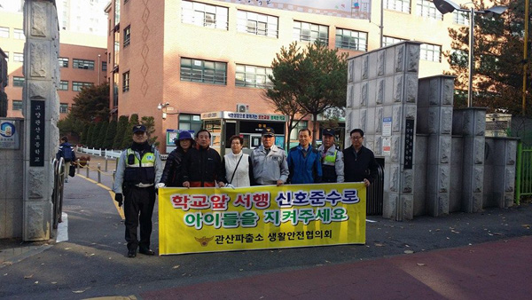 “관산생활안전협의회. 학교 안전 캠페인과 통학지도. 출근길이라 통행차량이 많았는데 선생님들과 어머니폴리스, 그리고 생활안전협의회 위원들이 함께 아이들의 안전한 등굣길을 위해 아이들 곁에 함께 했다. 아이를 키우는 아빠의 마음이 모두 다 한결같으리라. 학교앞 어린이보호구역에서는 꼭 서행해야겠다.”