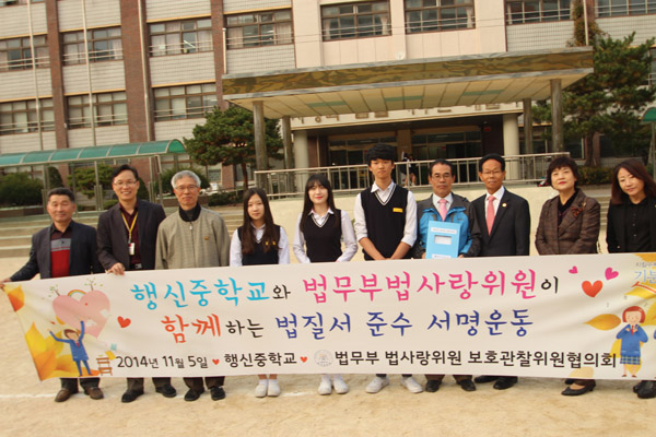 법무부 법사랑고양파주지역연합회 보호관찰위원(위원장 윤원식)은 지난 5일 덕양구 행신중학교에서 학생들을 대상으로 ‘법질서 준수 서명운동’을 진행했다.